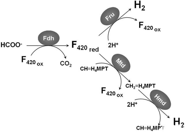 圖1、氫營養型產甲烷菌中H2合成的潛在途徑。第一條途徑包含Fdh和Fru。在該途徑中,Fdh還原F420。在含硒培養的細胞中,F420H2被[Ni-Fe]氫化酶Fru氧化。第二條途徑中,F420H2被Mtd氧化,將亞甲基-H4MPT還原為亞甲基-H4MPT,隨后被不含鎳的氫化酶Hmd重新氧化產生H2。