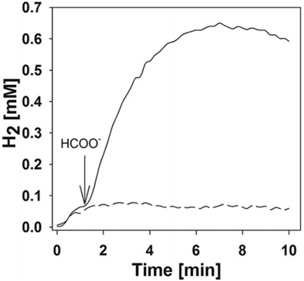 圖2、M.maripaludis靜息細胞從甲酸鹽產生H2的初始速率(實線)。細胞以甲酸鹽培養,經緩沖液洗滌后重懸于反應比色皿中。通過添加20 mM甲酸鈉(箭頭)啟動反應。虛線顯示未添加甲酸鹽的細胞懸浮液孵育結果。
