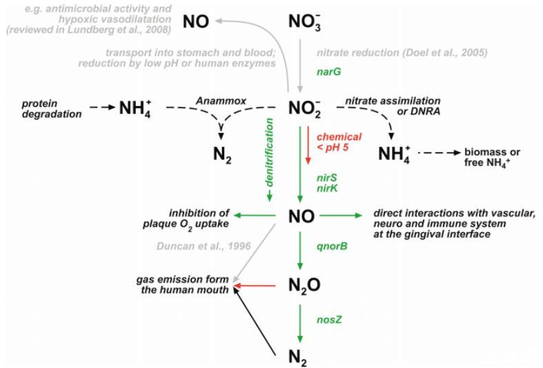我們的數據明確顯示,反硝化作用是與人類相關的微生物群落中的一個相關過程。迄今為止,人們一直認為人類體內的NO完全還原過程僅限于硝酸鹽還原成氨(DNRA)的異纖化過程,因為從人類體內分離出的大多數細菌都能進行這一反應。眾所周知,DNRA是一種嚴格的厭氧過程,在厭氧還原環境中比反硝化作用更受歡迎。因此,在人體腸道的還原性厭氧環境中,二硝化還原反應可能占主導地位,而在氧化程度較高的牙菌斑中則存在反硝化作用。反過來,可以想象DNRA存在于不易被清除的牙菌斑中,因此,牙菌斑一直處于缺氧狀態,而且還原程度較高。從理論上講,在這種生物膜中,NO2-的還原可能與氨的厭氧氧化(anammox)結合在一起(圖5,黑色虛線),特別是如果宿主組織或二硝基氧化還原酶的蛋白質降解可以提供氨的來源,正如在海洋開放水域棲息地所報道的那樣。不過,在細菌和NO3-共存的其他氧化環境中,也可能存在反硝化作用。例如,除唾液外,NO3-還存在于其他體液中,這些體液可能提供了一個相當氧化的環境(例如,血液中的NO3-為20-40μM,尿液中的NO3-約為500μM)。因此,反硝化作用可能與其他疾病或健康部位的微生物生物膜有關,如囊性纖維化肺、中耳炎耳朵、植入物、導管和陰道粘膜等。