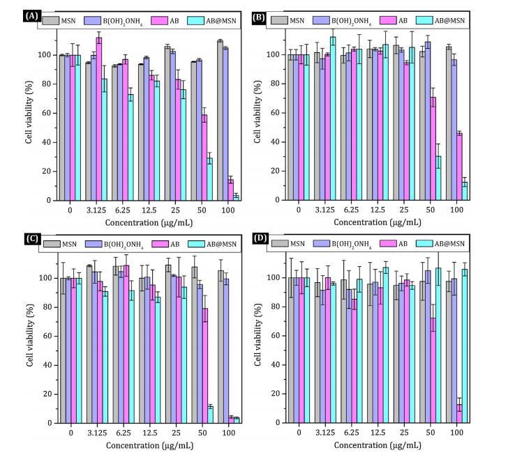 圖5游離原藥AB、載體MSN、分解產物B(OH)2ONH4和AB MSN納米藥物對HeLa(A)、B16-F10(B)和U87癌細胞(C)以及Hek-293T正常細胞(D)的細胞毒性比較。
