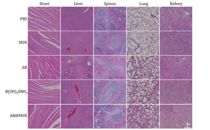 圖7用PBS對照組、載體MSN、游離原藥AB、分解產物B(OH)2ONH4,以及相同濃度的AB MSN納米藥物(AB稀釋10倍除外)治療20天后,主要器官(心、肝、脾、肺和腎)的HE染色結果。