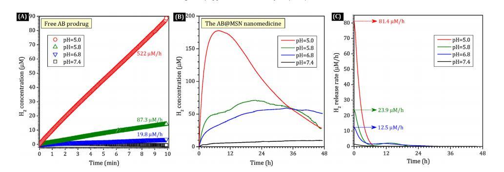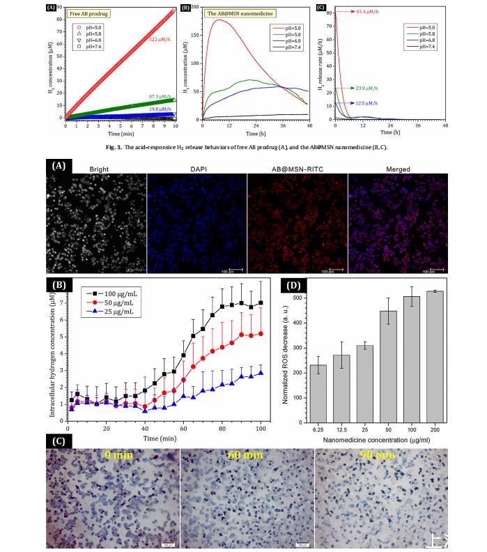 圖3游離AB原藥(A)和AB MSN納米藥物(B、C)的酸反應H2釋放行為。