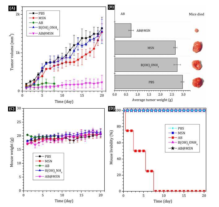 圖6使用AB MSN納米藥物對4T1腫瘤小鼠進行治療的結果:注射PBS對照組、游離原藥AB、載體MSN、分解產物B(OH)2ONH4和相同摩爾濃度的AB MSN納米藥物(AB稀釋10倍除外)后腫瘤體積的變化(A),治療20天后腫瘤重量的比較(B),小鼠體重隨時間的變化(C),以及小鼠生存能力隨時間的變化(D)。