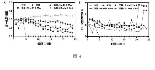 圖4是本發明實施例中葡萄糖剝奪同時抑制細胞自噬的心肌細胞電生理信號特征參數統計圖;其中,圖4中的(A)為24小時連續監測細胞自噬抑制劑3-甲基腺嘌呤(3-MA)處理葡萄糖饑餓心肌細胞的歸一化幅值變化曲線圖;圖4中的(B)為葡萄糖饑餓條件下3-MA對心肌細胞發放頻率的影響曲線圖。