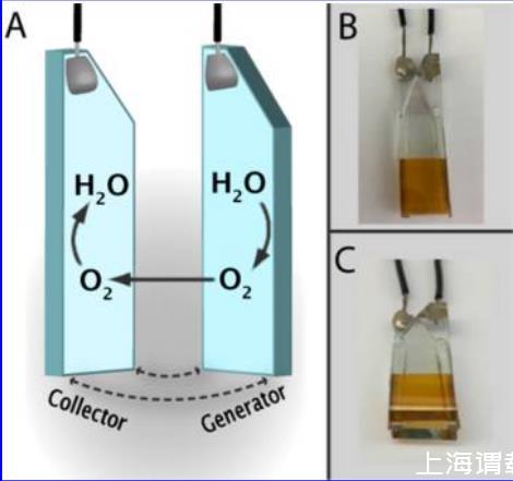 集電極-發生器池由兩個基于FTO的電極組成,導電面相對,間隔1 mm。雙電極組件的側邊用環氧樹脂完全密封,僅在頂部和底部邊緣留有開口。在電化學測量過程中,電解池部分浸入電解質溶液中,兩個電極由雙恒電位儀獨立控制電位。
