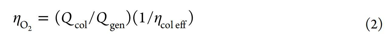 作為比較穩態電流的替代方法,可以使用計時庫侖法根據公式2確定法拉第效率,其中Q_{col}和Q_{text{gen}}是集電極和發生器電極通過的總電荷,η_{text{col eff}}是池的收集效率。此方法的使用需要一個計時電位實驗,其中發生器電極在足以產生O?的電位下保持規定時間,然后階躍到更負的電位(該電位下不產生O?);在發生器處于這兩個電位期間,集電極始終保持在足以選擇性還原O?的電位。產生的O?的電荷,即在發生器初始高電位階躍期間通過的總電荷(Q_{text{gen}}),與整個實驗期間集電極通過的電荷(Q_{col})進行比較。將發生器階躍到更負的電位從而終止O?生成,允許在集電極處通過還原耗盡電極之間溶液中的O?。這確保了實驗期間產生的O?得到充分核算。校正收集效率可解釋通過擴散損失到頂部空間或本體溶液的任何O?。通常,高電位階段持續300-600 s,低電位階段持續600-900 s,可有效測量η_{O?}。對于光電化學O?生成,暗態和光照階段分別決定了發生器處于靜息或產生O?的時期。