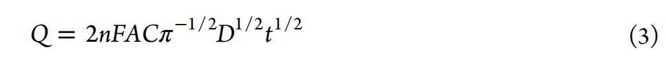確定在施加到集電極的電位下FTO表面發生的氧還原機制對于量化集電極感應到的O?量具有主要重要性。先前的研究表明,在FTO表面上O?的四電子還原占主導地位。為研究這一點,在空氣飽和溶液中進行了計時電流測量。在pH 7溶液中恒定電位-0.85 V vs SCE下,使用Cottrell方程的積分形式(公式3)分析電荷量隨時間(Anson圖)的變化可以確定轉移的電子數?。在該方程中,n是轉移的電子數,F是法拉第常數,A是電極面積,C是O?的濃度,D是O?的擴散系數。