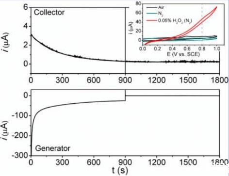 在集電極處每分子O?還原的整體電子計數為3的觀察結果,引發了在水的氧化實驗過程中H?O?可能對在發生器電極觀察到的陽極電流有貢獻的可能性。為研究這種可能性,在空氣飽和溶液中進行了一項C-G實驗,如圖5所示。在此情況下,FTO發生器在0至900 s期間置于-0.85 V vs SCE以進行O?還原,并在900至1800 s期間置于0 V vs SCE。FTO集電極在整個實驗期間置于0.8 V vs SCE以感應H?O?。如圖5插圖所示,使用FTO工作電極記錄的CV顯示,在存在H?O?時,0.8 V vs SCE處的陽極電流比在空氣或缺乏H?O?的N?飽和溶液中有所增加。重要的是,在實驗過程中未觀察到FTO集電極處陽極電流增加,這表明如果H?O?在O?還原過程中形成,它不會對在對電極觀察到的電流有貢獻。