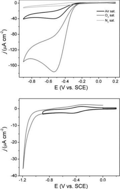 先前的研究已經評論了FTO電極上的氧氣還原,并將其用作O?存在的診斷。圖4顯示陰極電流隨溶液中O?含量的增加而明顯增加。在-0.85 V vs SCE處的電流幅度從最低的N?飽和溶液增加到空氣飽和溶液,再到O?飽和溶液。在電解質條件相同且僅[O?]可變的條件下,-0.85 V vs SCE處的陰極電流大小直接對應于溶液中的氧氣濃度。在沒有O?的情況下,伏安圖顯示出先前記錄的FTO電極相同行為,在低電位(≤-1 V vs SCE)下觀察到催化電流,這是由H?的產生引起的。重要的是,在有和沒有O?存在下的CV比較顯示,與O?存在相關的陰極電流起始點大約在-0.2 V vs SCE。