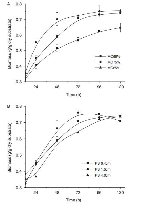 在生物量轉(zhuǎn)化過程中,固態(tài)底物的水分含量(MC)和顆粒長度(PL)是影響生物量轉(zhuǎn)化效率和微生物生長的主要參數(shù),特別是對于固態(tài)發(fā)酵。^17,18結(jié)果表明,對于所有實驗,從12小時到72小時的發(fā)酵時間內(nèi),真菌生物量迅速增加,然后在72小時到120小時的發(fā)酵時間內(nèi)保持恒定值(圖1)。最大的生物量約為每克底物0.75克,在85%MC和0.4 cm PL條件下,發(fā)酵時間從12到120小時獲得(圖1)。圖1顯示,SSF中的真菌生物量在水含量實驗中遵循85%>75%>65%的順序,在顆粒長度實驗中遵循0.4 cm>1.5 cm>4.0 cm的順序。結(jié)果表明,高水分含量和小顆粒長度有利于真菌生物量的增加,可能是因為它增強了營養(yǎng)物質(zhì)傳遞和利用效率。^19
