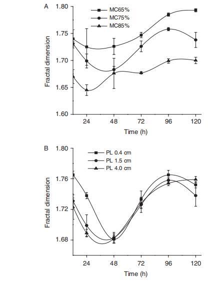 底物形態(tài)結(jié)構(gòu)因發(fā)酵過程的利用和降解作用而被真菌生長明顯改變。^20,21在使用Penicillium decumbens JUA10的SSF過程中,真菌菌絲體與底物交織在一起,形成難以分離的混合物。在先前的研究中,分形維數(shù)已被有效地用于評估真菌-底物復合物。圖2顯示,SSF中的分形維數(shù)在水含量實驗中遵循65%>75%>85%的順序,在顆粒長度實驗中遵循0.4 cm>1.5 cm>4.0 cm的順序。結(jié)果表明,高水分含量和大顆粒長度提供了最低的分形維數(shù)。同時,有趣的是,分形維數(shù)在發(fā)酵時間從12小時到48小時期間下降,然后在發(fā)酵時間從48小時到120小時期間增加。造成這種情況的可能原因是,在真菌生長的早期階段,由于真菌占據(jù)底物內(nèi)部空間,分形維數(shù)降低。然而,隨著發(fā)酵時間的增加,真菌利用導致固態(tài)底物分解成小塊,這導致底物的分形維數(shù)逐漸增加。同樣有趣的是,發(fā)酵48小時后不同顆粒長度的分形維數(shù)差異小于發(fā)酵48小時前的差異(圖2(B))。造成這種情況的可能原因是,大顆粒長度生物質(zhì)在48小時后被降解成小塊。同時,小顆粒長度生物質(zhì)在發(fā)酵過程中容易團聚,然后在固態(tài)發(fā)酵后期顆粒長度生物質(zhì)的差異減小,這導致相應的分形維數(shù)差異也減小。因此,結(jié)果表明,分形維數(shù)可以有效地表達底物形態(tài)結(jié)構(gòu)的變化,并且也可以在固態(tài)發(fā)酵中不同水分含量和顆粒長度下表征真菌生物量的相應增長。