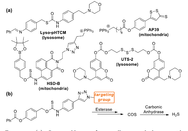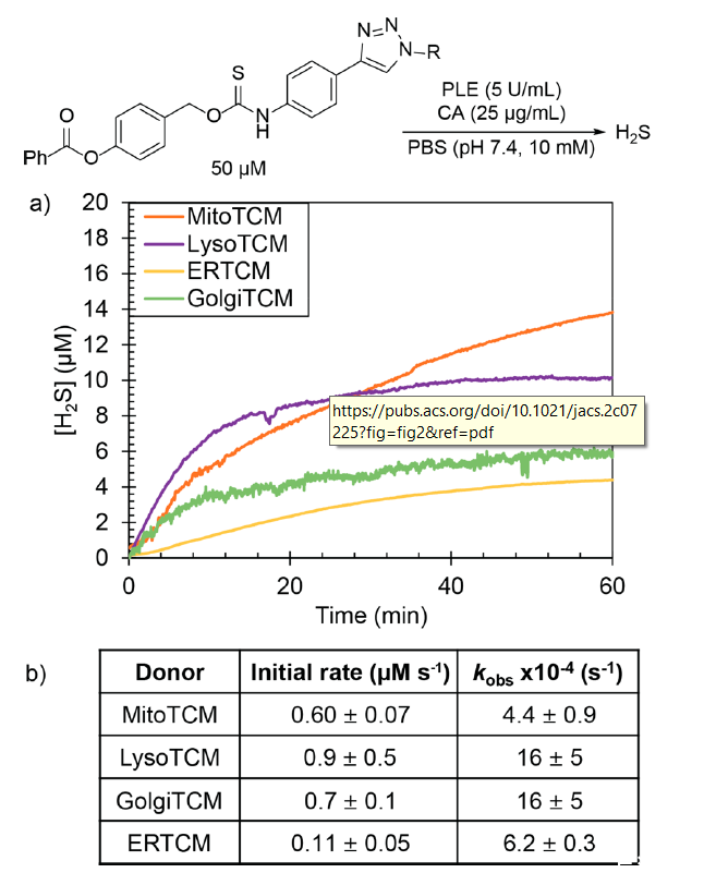 圖1、(a)當前具有靶向細胞器的細胞器靶向供體庫,如下所示。(b)通過酯酶激活的籠狀硫代氨基甲酸酯靶向遞送羰基硫化物(COS)/硫化氫。