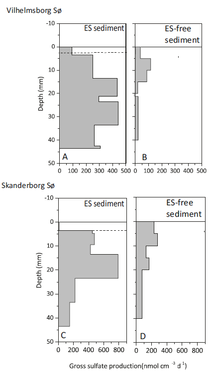 圖3、Vilhelmsborg S?(a,b)和Skanderborg S?(c,d)的ES沉積物和無ES沉積物中的硫酸鹽還原率(灰色條)和硫酸鹽濃度(黑點)。誤差線表示平均值的標準誤差(n=3)。a和c中的虛線表示含氧區的下邊界。