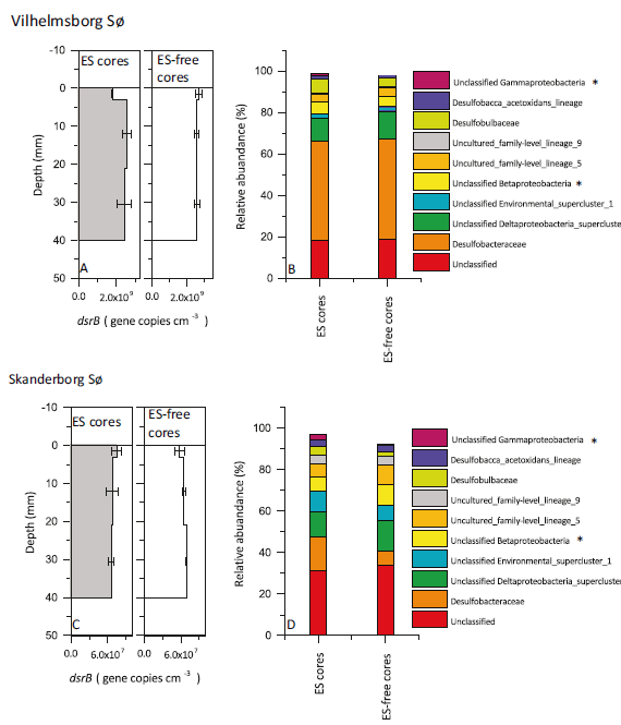 圖5、Vilhelmsborg S?(a,b)和Skanderborg S?(c,d)沉積物中dsrB基因的豐度和家系相關性。對于每個面板,左側條形代表ES沉積物,右側條形代表不含ES的沉積物。堆疊條形圖(b,d)顯示檢測到的10個最豐富的dsrB家族的平均相對豐度;氧化型dsrB家族用星號標記。對于未分類的dsrB家族,給出下一個更高的分類分類等級。