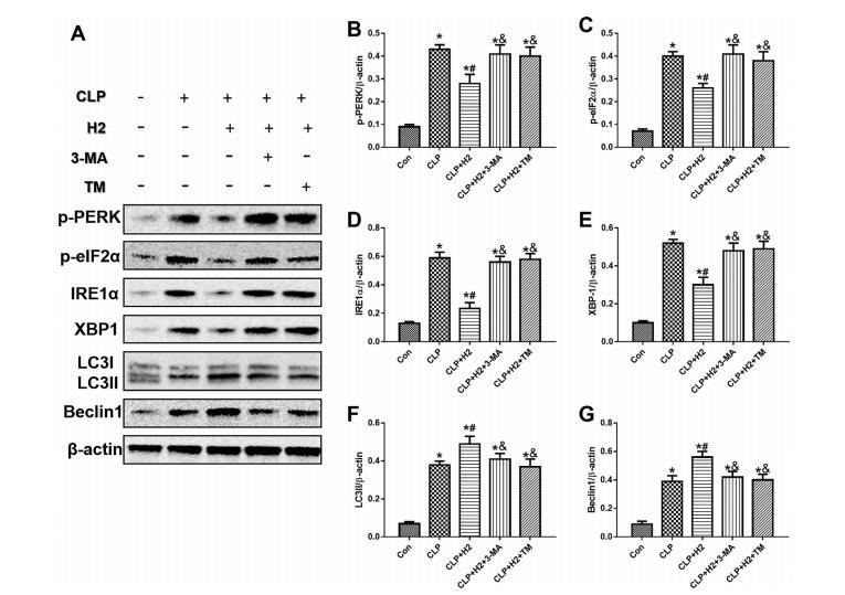 圖8:氫氣通過ERS和自噬的交叉作用調控膿毒癥小鼠肺中ERS和自噬相關蛋白的表達。給小鼠腹腔注射ERS誘導劑TM和自噬抑制劑3-MA后,在CLP12小時后收集肺樣本,通過Western印跡檢測ERS相關蛋白p-PERK(A和B)和p-eIF2α(A和C)、IRE1α(A和D)和XBP1(A和E)的表達,以及自噬相關蛋白LC3(A和F)和Beclin1(A和G)的表達。