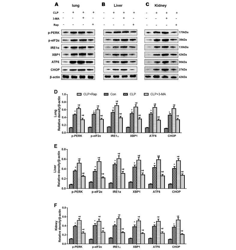 以前的文獻表明,ERS調節自噬途徑的激活。但自噬是否能調節膿毒癥中ERS的活性呢?為了回答這個問題,我們分別給予Rap和3-MA(一種誘導劑和抑制劑),并測量了CLP小鼠肺、肝和腎組織中的ERS蛋白水平。結果表明,與CLP組相比,3-MA加劇了CLP+3-MA組小鼠肺(圖7A和D)、肝(圖7B和E)和腎組織(圖7C和F)中p-PERK和peIF2α、CHOP、ATF4、IRE1α和XBP1表達的增加(圖7)。然而,與CLP組相比,自噬誘導劑Rap可抑制CLP操作誘導的這些指標的增加(圖7)。總之,這些結果表明,自噬活性的增加可減輕敗血癥的ERS。
