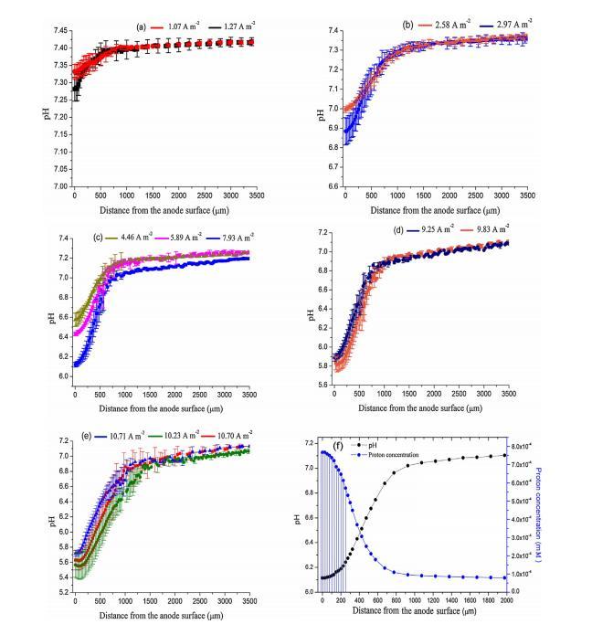 圖2.在電流密度為1.07A m-2和1.27A m 2時Geobacter生物膜內(nèi)的平均pH分布,邊界層和批量溶液(a);在2.58 A m 2和2.97 A m 2時(b);在4.46 A m 2,5.89 A m 2和7.93A m 2時(c);在9.25 A m 2和9.83 A m 2時(d);在10.71A m 2,10.23 A m 2和10.70A m 2時。誤差線表示標(biāo)準(zhǔn)偏差。圖2(f)是在7.93A m 2下測量的剖面之一,以及Geobacter生物膜內(nèi)上方和內(nèi)部的質(zhì)子濃度剖面。