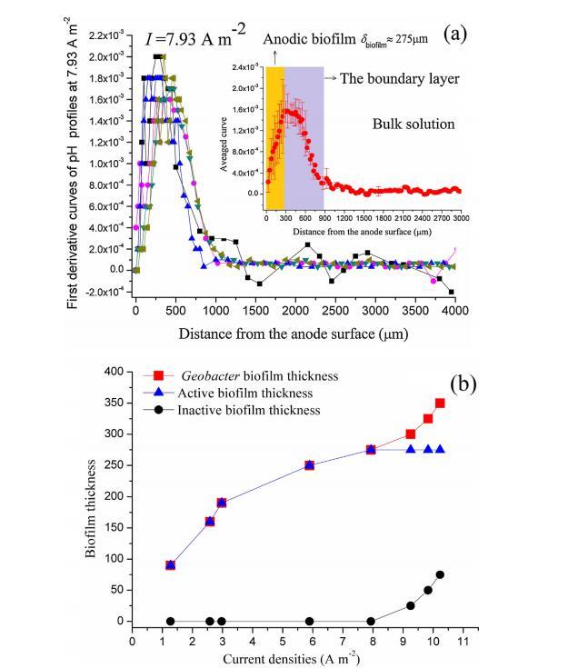 以7.93 Am-2的pH-深度剖面為例,選擇了5個位置進(jìn)行pH測量。它們的一階導(dǎo)數(shù)圖在圖3(a)中呈現(xiàn)。將這些圖的平均值作為插圖顯示的平均一階曲線。可以清楚地看到,在批量溶液、邊界層和Geobacter生物膜中,斜率完全不同。在批量溶液中,導(dǎo)數(shù)保持在零附近,因?yàn)榇颂幍膒H值大致是常數(shù),然后導(dǎo)數(shù)遠(yuǎn)離零,反映出微電極逐步向下移動進(jìn)入邊界層。在那之后,它逐漸增加到pH/mm的斜率,直到獲得最大斜率。可以發(fā)現(xiàn),在邊界層中,導(dǎo)數(shù)并不保持不變,這可能是由邊界層中的游離細(xì)菌引起的。實(shí)際上,最大斜率的位置是陽極生物膜和邊界層的界面。這是因?yàn)殡娏骰蛸|(zhì)子H+實(shí)際上是在生物膜內(nèi)產(chǎn)生的,并且底物在這個界面上接觸到。可以預(yù)期,由于H+和底物的擴(kuò)散效應(yīng),離開界面的位置的H+梯度和因此pH值的梯度趨向于減小。在Geobacter生物膜內(nèi)部,斜率急劇下降,直到達(dá)到生物膜底部,因?yàn)閮?nèi)部的有效擴(kuò)散系數(shù)減小。正如可以清楚地看到的那樣,插圖中的最大斜率的拐點(diǎn)位于約275mm的深度處,因此是生物膜厚度dbiofilm。代謝不活躍的生物膜層也可以通過在該區(qū)域檢測到的pH值與活躍生物膜相比呈相反趨勢來檢測到。如圖2(d)和圖2(e)所示,在陽極表面附近,pH值要么保持在一個較低值的常數(shù),要么隨深度減小而減小。這表明,這里的質(zhì)子主要是從外部活躍細(xì)胞傳輸?shù)摹_@也解釋了為什么這個區(qū)域的導(dǎo)數(shù)等于或小于零。