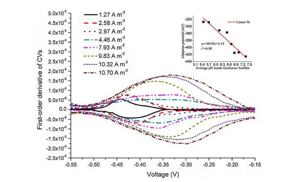 圖5.CV的一階導數圖(di/dV),插圖顯示了Geobacter生物膜內平均pH水平變化的中點電位。