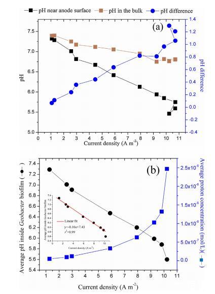 圖4.陽極表面附近和批量溶液中的pH變化以及作為電流密度函數的pH差異(a)。Geobacter生物膜內平均pH變化曲線及各種電流密度下相應的質子濃度曲線,插圖顯示了電流密度和平均pH值之間的線性相關性(r2=0.99)(b)。