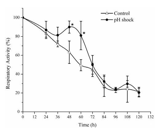 陽離子轉運ATP酶在DNA微陣列中高表達,表明陽離子轉運加速以中和pH的變化。此外,將氫離子轉運進出細胞膜會消耗大量ATP,這也解釋了下面關于菌絲體呼吸活性的現象。另外,應該注意的是,三羧酸循環導致胞外pH上升,而糖酵解和谷氨酸的合成通常導致酸化。因此,pH沖擊組中的pH波動可能是碳水化合物和氨基酸代謝快速消耗的綜合結果。