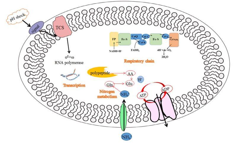 簡而言之,這些DEGs主要與氨基酸代謝、細胞過程和信號轉導以及信息儲存和處理相關。此外,通過qRT-PCR分析驗證了關鍵基因的動態變化。在轉錄變化方面,DNA微陣列和qRT-PCR分析之間顯示出良好的一致性,表明了微陣列數據的可靠性??梢酝茰y,在胞外pH沖擊下,細胞壁接收到的脅迫信號通過雙組分系統進行轉導。然后由雙組分系統調控的ECFσ因子將與核心酶一起作用于下游基因并激活細胞防御系統。最終,營養物質和離子轉運加速,導致葡萄糖代謝、氨基酸代謝、呼吸鏈和其他生理活動的變化,同時也緩解了堿刺激并促進了Val-A的生物合成。