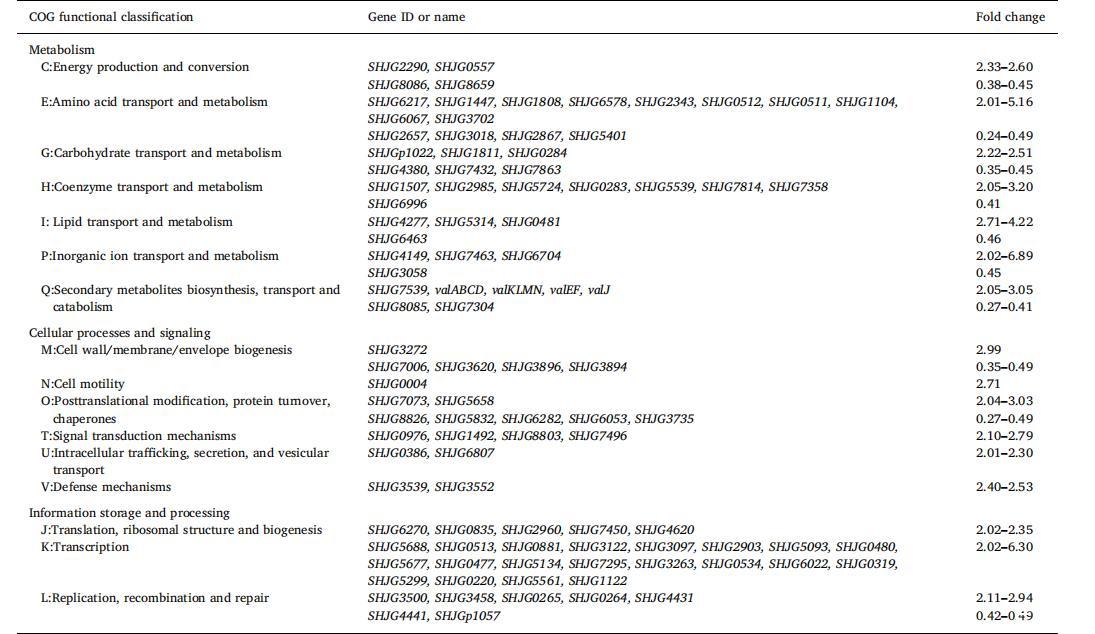 使用倍數變化2且p<0.5的統計標準,在菌株5008中共鑒定出146個pH沖擊下的差異表達基因(DEGs)(表1)。pH沖擊下顯著差異表達的基因主要分配于代謝、細胞過程和信號傳導以及信息儲存和處理相關的功能。正如預期的那樣,除糖基轉移酶基因valG外,大多數Val-A生物合成基因的轉錄水平在pH沖擊下均增強。