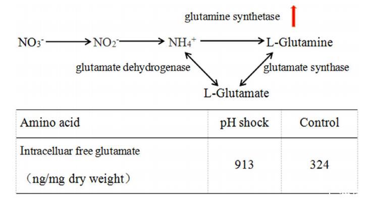 圖5.pH沖擊后5008的氮同化途徑和胞內游離谷氨酸的變化。