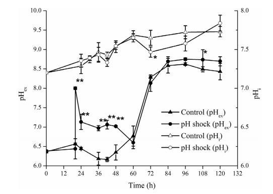 胞內pH對于微生物的生長和代謝至關重要,它可以影響營養物質的吸收和利用、蛋白質合成、線粒體呼吸、碳水化合物代謝和其他重要的生命活動(Cotter et al.,2001)。因此,只有維持胞內pH的穩定,才能保證微生物的正常生長和代謝。如圖3所示,在整個發酵過程中,胞內pH略有上升,從開始的7.21到最后7.73。Corvini等人(Corvini et al.,2004)也使用BCECF-AM熒光探針測定普拉特鏈霉菌(Streptomyces pristinaespiralis)的胞內pH,其范圍在6.5至8.5之間。還發現基因SHJG7463編碼