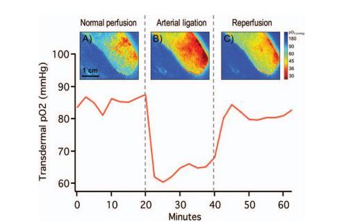 在獲得穩定連續的基線測量值后,將氧傳感繃帶貼在左后肢克拉克電極監測區域表層的剃毛皮膚上。讓繃帶風干1分鐘,然后涂上一層透明的隔離層,以減緩室氧和傳感繃帶之間的氧氣交換速度。如前所述,通過計算紅通道和綠通道圖像的強度比來生成氧張力(組織pO2)圖像。