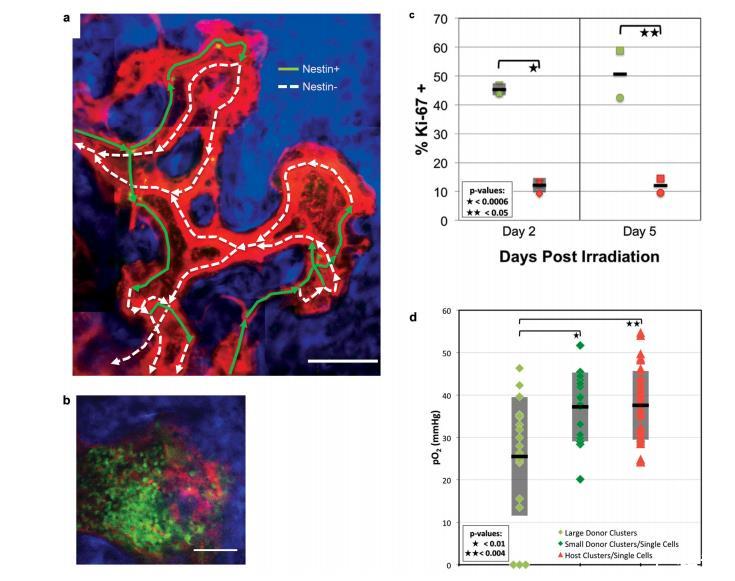 (a)nestin-GFP小鼠的血管連接圖顯示,nestin+血管位于竇道的上游并向竇道排水。表示血流方向的箭頭是通過(guò)視頻速率成像跟蹤標(biāo)記的RBC的移動(dòng)確定的,并疊加在BM血管的最大強(qiáng)度投影圖上(紅色=血管染料,綠色=nestinGFP/RBC,藍(lán)色=SHG骨信號(hào))。綠色實(shí)線表示血管與鄰近的nestin+細(xì)胞,白色虛線表示nestin-血管。縮放條~100μm。(b)一個(gè)通用DsRed受體的骨髓在移植了來(lái)自通用GFP供體的2,500萬(wàn)個(gè)骨髓細(xì)胞5天后的體內(nèi)圖像。紅色=DsRed,綠色=GFP,藍(lán)色=骨的SHG。縮放條~100μm。(c)移植后第2天(n=3只小鼠)和第5天(n=2只小鼠),通過(guò)FACS對(duì)綠色(供體)和紅色(宿主)骨髓細(xì)胞進(jìn)行Ki-67染色。每個(gè)符號(hào)代表不同的小鼠。刻度線(第2天)為平均值的±標(biāo)準(zhǔn)偏差。(d)與小的供體細(xì)胞群/單細(xì)胞(4只小鼠,n=16個(gè)位置)和宿主細(xì)胞群/單細(xì)胞(5只小鼠,n=40個(gè)位置)相比,大的供體細(xì)胞群(4只小鼠,n=19個(gè)位置)區(qū)域的體內(nèi)pO2值。圖中顯示了每組數(shù)據(jù)的平均值(黑線)和±標(biāo)準(zhǔn)偏差(陰影框)。