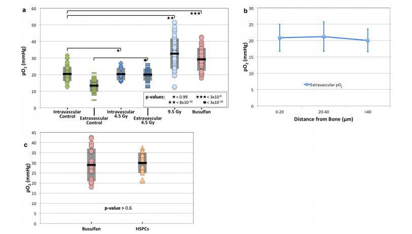(a)亞致死(4.5Gy,n=5只小鼠的13個(gè)血管和29個(gè)血管外位置)或致死(9.5Gy,n=2只小鼠的40個(gè)位置)伽馬輻照兩天后,或丁胺(35mg/kg,n=6只小鼠的40個(gè)位置)調(diào)理兩天后的BM pO2。圖1d中未經(jīng)處理的對(duì)照組pO2與之比較。(b)血管外pO2測(cè)量值與4.5Gy照射2天后測(cè)量位置到骨表面距離的函數(shù)關(guān)系圖(n=44個(gè)位置,來(lái)自4只小鼠)。(c)HSPC歸巢部位的pO2與丁胺苯磺吡啶治療受體的整體BM pO2的比較(n=17個(gè)HSPC,來(lái)自6只小鼠)。未觀察到有統(tǒng)計(jì)學(xué)意義的差異。在(a)和(c)中,顯示了每組數(shù)據(jù)的平均值(黑線)和±標(biāo)準(zhǔn)偏差(陰影框)。