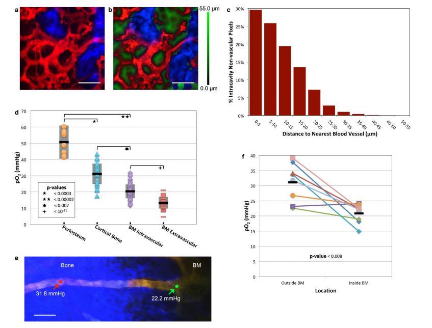 (a)小鼠腓腸肌的可見光內(nèi)最大強(qiáng)度圖像(約75μm厚),顯示血管(紅色,Qtracker655血管染料)和骨(藍(lán)色,膠原SHG)。(b)三維虛擬成像堆棧的相應(yīng)單個(gè)平面,顯示血管(紅色)、骨SHG(藍(lán)色)以及BM中每個(gè)血管外像素到最近血管壁的三維歐氏距離測(cè)量值(EDM,綠色)。(c)全三維成像堆棧中所有EDM的直方圖。(d)與骨膜和皮質(zhì)骨血管中的pO2相比,骨髓中的pO2明顯較低。每個(gè)點(diǎn)代表一個(gè)單獨(dú)血管或間隙位置的pO2測(cè)量值(8只小鼠的骨膜、皮質(zhì)骨、BM血管內(nèi)和BM血管外的血管/位置分別為8、21、55和40個(gè))。圖中顯示了每組數(shù)據(jù)的平均值(黑線)和±標(biāo)準(zhǔn)偏差(陰影框)。(e)血管從骨骼進(jìn)入BM的最大強(qiáng)度投影圖像。骨骼(藍(lán)色)和血管(黃色)分別用SHG和RhodamineB-dextran/PtPC343熒光勾勒。兩個(gè)箭頭分別指向血管進(jìn)入BM前后測(cè)量pO2的位置。(f)追蹤進(jìn)入BM的單個(gè)血管時(shí)pO2的下降(n=4只小鼠的8根血管)。顯示的是每組數(shù)據(jù)的平均值(黑線)。刻度線~100μm。