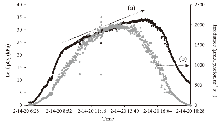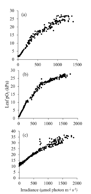 圖3、葉片內(nèi)pO?隨光照變化的二相動(dòng)態(tài)(示例)。葉片內(nèi)pO?(黑色)與光合有效輻射(灰色)隨時(shí)間變化。(a)2019-09-11;(b)2020-02-14;(c)2020-05-07。顯示日出后快速上升至28–36 kPa,之后隨光強(qiáng)增加緩慢上升。