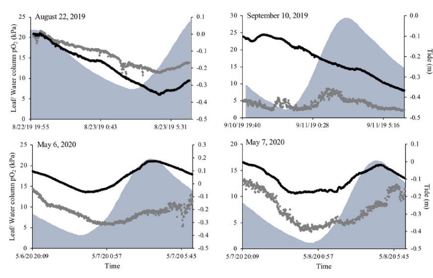 圖5、夜間葉片與水柱pO?受潮汐影響。夜間(日落至日出)葉片(灰線)與水柱(黑線)pO?以及潮位(陰影灰)漲潮時(shí)水柱O?升高,葉片內(nèi)O?同步增加5–8 kPa,形成潮補(bǔ)氧效應(yīng)。