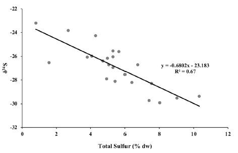 圖2、完整T.testudinum草甸中,根組織的δ3?S與總硫含量(TS)之間的線性關(guān)系(R2=0.67)。