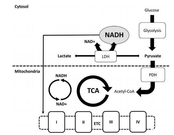 本研究的主要發現是,在高血糖條件下,NRK-52E細胞經草氨酸處理后,新陳代謝完全改道。這似乎導致了基礎和最大呼吸能力的提高以及乳酸生成的減少。乳酸鹽的產生與氧化還原平衡密切相關,即與細胞膜NAD+/NADH平衡密切相關。有趣的是,乳酸鹽生成量的主要變化受高血糖條件的影響,而氧化還原平衡(NAD+/NADH比率)、細胞活力和增殖則受草酸鹽處理的影響。這表明乳酸脫氫酶LDH抑制確實會導致NAD+/NADH比率發生巨大變化,進而引導NRK-52E細胞增加氧化磷酸化(圖5)。這些發現與高度糖酵解細胞的報告一致,在高度糖酵解細胞中,草氨酸已被證明能將糖酵解通量轉向氧化磷酸化,即把沃伯格代謝表型(即使在有足夠氧氣維持氧化磷酸化的情況下,乳酸鹽的產生也會增加)轉變為巴斯德代謝表型。