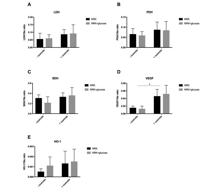 為了了解代謝和呼吸的變化是如何發生的,我們檢測了關鍵酶的mRNA表達水平,發現LDH、丙酮酸脫氫酶(PDH)和琥珀酸脫氫酶(SDH)的表達幾乎不受高血糖培養條件的影響。另一方面,草氨酸處理會增加正常和高血糖NRK-52E細胞培養物中所有基因的表達,但并不顯著(圖4A-C)。在正常和高血糖的NRK-52E細胞中,草酸鹽處理和未處理的NRK-52E細胞中血管內皮生長因子的表達均有明顯變化(p=0.0004)(圖4D),血紅素氧合酶-1(HO-1)標記物的表達也有同樣的趨勢(圖4E)。