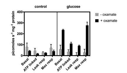 為了評估在高血糖培養中誘導的新陳代謝以及草氨酸處理后無氧代謝的減少是否與NRK-52E細胞耗氧量的變化有關:測量了基礎呼吸、ATP鏈接呼吸、泄漏呼吸和最大呼吸。高血糖條件下的NRK-52E細胞和草酸鹽處理本身都不會對呼吸參數產生影響。而高血糖條件和草氨酸處理的結合則顯著增加了所有呼吸參數(p<0.0001)(圖3)。