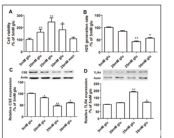 圖1. 高葡萄糖(HG)誘導(dǎo)小鼠系膜細(xì)胞顯著過度增殖,這可能部分歸因于內(nèi)源性H?S合成缺陷或TLR4激活。(A)HG誘導(dǎo)小鼠系膜細(xì)胞顯著過度增殖。25 mM甘露醇處理未顯著改變小鼠系膜細(xì)胞活力(數(shù)值為均值±標(biāo)準(zhǔn)誤;P < 0.05,P < 0.01 vs. 5mM葡萄糖;##P < 0.01 vs. 25 mM葡萄糖;n = 4)。(B)與5 mM葡萄糖相比,25 mM和30 mM HG處理顯著降低H?S生成速率(數(shù)值為均值±標(biāo)準(zhǔn)誤;P < 0.05,P < 0.01 vs. 5 mM葡萄糖;n = 4)。(C)HG處理以濃度非依賴性方式顯著降低CSE表達(數(shù)值為均值±標(biāo)準(zhǔn)誤;P < 0.05,P < 0.01 vs. 5 mM葡萄糖;n = 4)。(D)25mM和30mM HG處理顯著增加TLR4表達(數(shù)值為均值±標(biāo)準(zhǔn)誤;P < 0.05,**P < 0.01 vs. 5 mM葡萄糖;n = 4)。