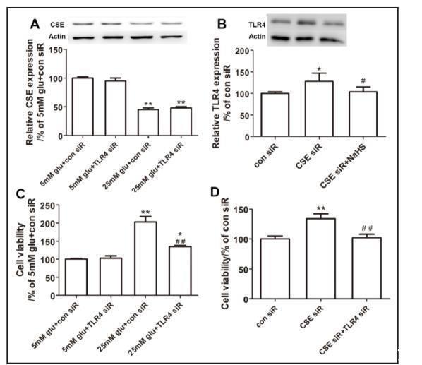 蛋白質印跡顯示,高葡萄糖(25 mM)孵育顯著激活了TLR4的表達(圖1D)。通過siRNA下調TLR4可以逆轉小鼠系膜細胞的過度增殖(圖2C)。有趣的是,敲低CSE也顯著增加了小鼠系膜細胞中的TLR4表達(圖2B);NaHS處理可以顯著抑制TLR4激活并抑制細胞過度增殖(圖2B)。此外,TLR4下調并未顯著改變高葡萄糖誘導的CSE表達抑制(圖2A)。然而,TLR4沉默可以顯著消除由CSE下調引起的細胞過度增殖。這些結果暗示在由高血糖誘導的系膜細胞過度增殖通路中,TLR4可能位于CSE通路的下游。