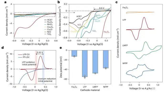 在核心吸附劑材料的設計與篩選中,研究團隊系統評估了多種過渡金屬氧化物的催化活性,發現鐵基材料在含鈾溶液中展現出最大的還原電流和最小的還原過電位(圖2a,2b)。CV曲線測試證實,相比于四氧化三鐵,鐵基磷酸鹽材料具備優異的電子緩沖與可逆釋放能力(圖2c)。進一步分析發現,鐵基磷酸鹽材料的氧化電位與其催化鈾酰離子還原的電位之間存在數百毫伏的勢差,這為驅動鈾酰離子的自發還原提供了充足的熱力學動力(圖2d)。此外,Zeta電位測試表明,鐵基磷酸鹽材料具有更強的表面電負性,有利于通過庫侖引力捕獲鈾酰離子(圖2e)。