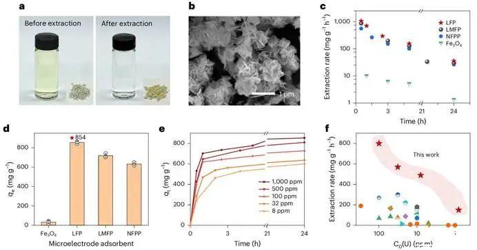新策略的優越性在鈾提取性能測試中得到了充分驗證。當微電極吸附劑加入初始濃度為1000 ppm的模擬含鈾廢水中,溶液標志性的亮黃色在6小時內顯著褪去(圖3a),同時掃描電鏡圖像顯示其表面沉積了大量含鈾納米片層(圖3b)。性能對比實驗明確顯示,得益于電子緩沖機制,三種鐵基磷酸鹽微電極的吸附速率和容量均遙遙領先于不具備電子緩沖能力的四氧化三鐵(圖3c,3d)。其中,性能最優的磷酸鐵鋰(LFP)微電極初始提取速率高達1062 mg g?1 h?1,飽和吸附容量達854 mg g?1,在不同初始濃度的廢水中均表現出快速、高效的提取能力(圖3e,3f)。