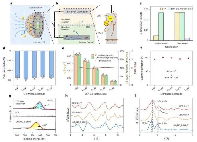為深入揭示“時空解耦”策略的內在機理,團隊設計了精巧的“原電池”模擬裝置,對微電極的反應過程進行解構分析。結果有力地證明了LFP微電極內部作為電子緩沖庫、外部表面進行催化還原的協同機制(圖4a,4b,4c)。Zeta電位測試表明,材料在放電過程中始終保持穩定的表面負電性,從而持續吸引鈾酰離子(圖4d)。通過定量分析發現,鋰離子的釋放與鈾的還原嚴格遵循2:1的化學計量比,證實了電子在反應中被精準利用,利用率接近100%(圖4e,4f)。U 4f XPS和同步輻射表征則從原子層面確認了鈾被還原的價態變化及其與表面活性位點的相互作用(圖4g,4h,4i)。