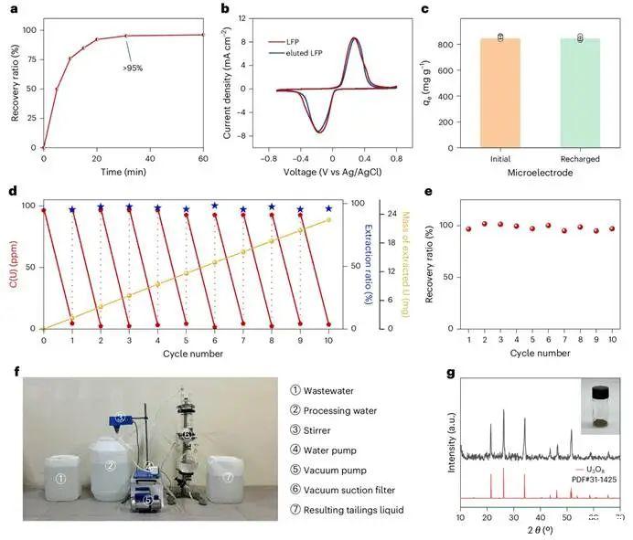 優異的性能之外,該系統的可重復利用性和實際應用潛力同樣出色。實驗表明,吸附飽和后的LFP微電極在環保的洗脫液中,30分鐘內即可實現超過95%的鈾回收(圖5a)。再生后的LFP微電極,其結構和電化學活性幾乎無衰減,吸附性能與初始狀態保持一致(圖5b,5c)。在長達10次的連續“提取-洗脫-再生”循環測試中,系統性能始終保持穩定,展現了其工業應用的魯棒性(圖5d,5e)。更進一步,團隊搭建了中試規模的處理裝置,成功處理了50升源自真實鈾礦、濃度僅為0.545 ppm的廢水,平均去除率高達96%,并最終獲得了高純度鈾產物(圖5f,5g)。