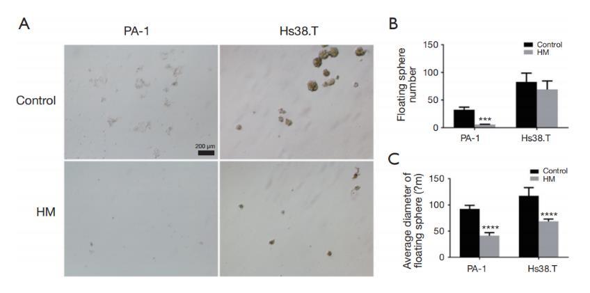 圖4、氫分子對人卵巢癌細胞球體形成的抑制作用。(A)代表性圖像顯示氫分子對球體形成的抑制作用;(B)氫氣處理顯著減少了PA-1細胞的懸浮球數量,而在Hs38.T細胞中未觀察到顯著變化;(C)在Hs38.T和PA-1細胞中,氫氣組的懸浮球平均直徑均顯著小于對照組。