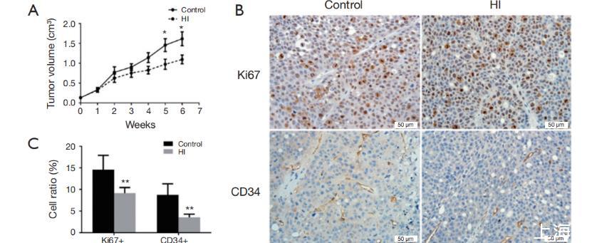 圖1、氫氣吸入抑制Hs38.T異種移植的BALB/c裸鼠的腫瘤生長和血管生成。(A)吸入氫氣6周導致平均腫瘤體積顯著減少;(B)免疫組織化學檢查顯示Ki67和CD34的表達被氫分子下調;(C)免疫組織化學染色的定量分析。
