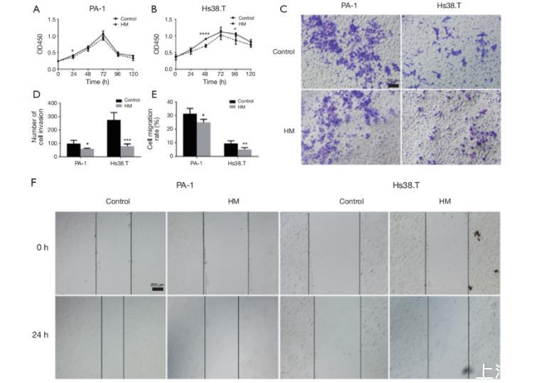 圖2、氫分子對人卵巢癌細胞功能的影響。(A,B)CCK-8實驗證明氫氣處理抑制了PA-1和Hs38.T細胞的增殖;(C,D)基質膠侵襲實驗顯示氫氣處理顯著抑制PA-1和Hs38.T細胞的侵襲;(E,F)劃痕實驗表明氫分子抑制了PA-1和Hs38.T細胞的遷移。