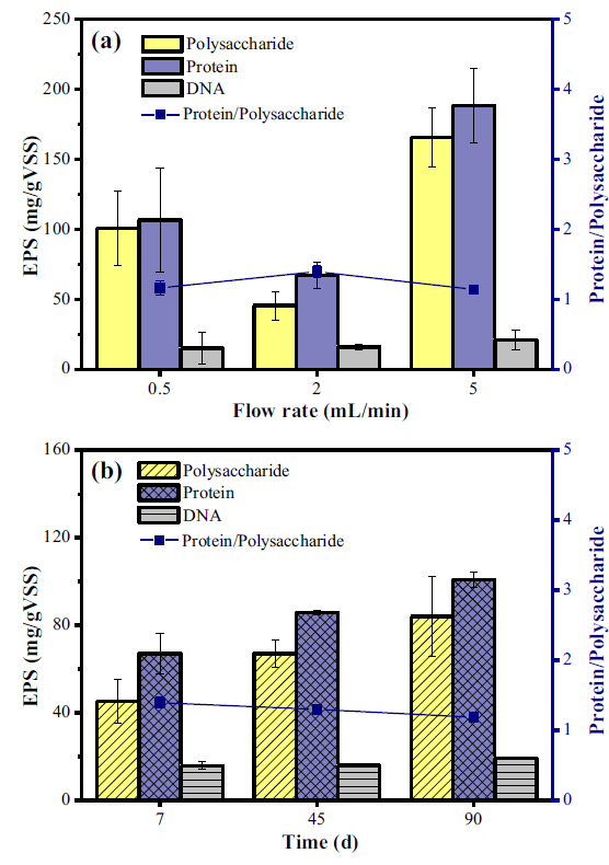 圖5、不同流速和培養(yǎng)時(shí)間對EPS的影響(a)0.5 mL/min、2 mL/min、5 mL/min;(b)培養(yǎng)時(shí)間為7天、45天、90天。