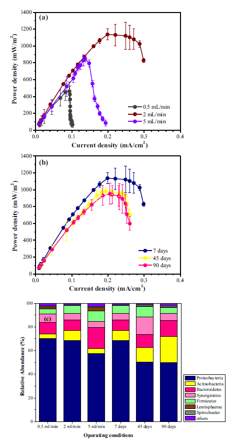 圖2、功率密度曲線與微生物群落結(jié)構(gòu)。(a)流速影響:2 mL/min時(shí)獲得最高功率密度(1137.0±65.5 mW/m2),0.5和5 mL/min分別為462.2±113.0和846.8±37.1 mW/m2。(b)培養(yǎng)時(shí)間影響:7天培養(yǎng)功率密度最高(1137.0±65.5 mW/m2),45天和90天分別為980.6±42.2和950.8±125.1 mW/m2。(c)門水平微生物組成:主要包含變形菌門(Proteobacteria)、擬桿菌門(Bacteroidetes)、放線菌門(Actinobacteria)等。7天培養(yǎng)時(shí)變形菌門占比最高(68%),隨培養(yǎng)時(shí)間延長而減少。